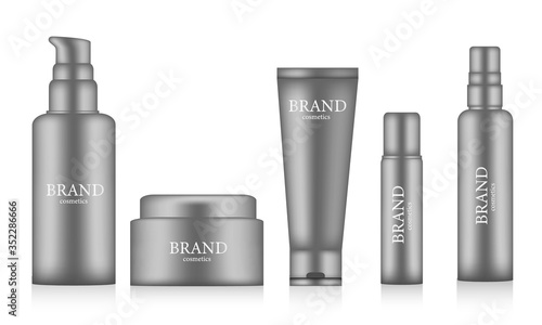 Body care cosmetics packaging vector mock up set. Realistic beauty and skin care products plastic containers bottle, tube, jar, stand up pouch bag for cream, shower gel lotion oil scrub salt for bath.