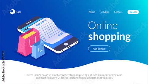 Books online landing page website template. Vector isometric illustration of man taking book from bookshelf in smartphone store. Online digital library concept.