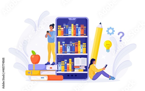 Huge smartphone bookstore with people reading books while sitting and lying on bookshelves, vector flat illustration. Book store online shopping concept for web banner, website page etc.