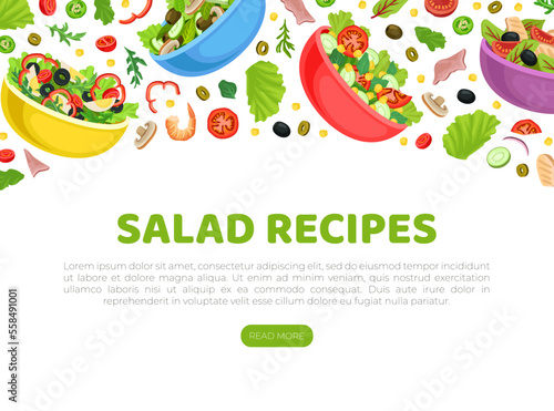 Bowl with delicious vegan salad, hand holding fork with broccoli, vector top view illustration in paper art style. Healthy diet, vegetarian meal. Healthy food poster, banner design template.