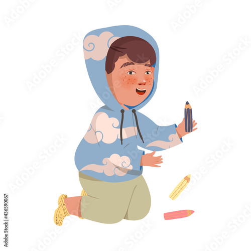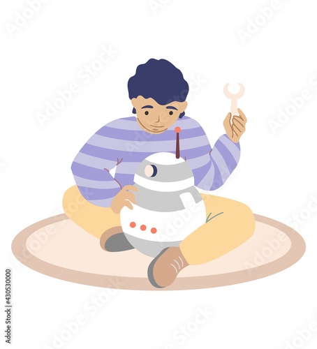 Boy schoolchild studying robotics subject vector icon isolated on white background.