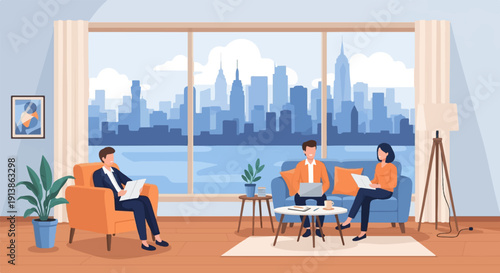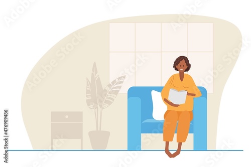 Vector illustration of young man with smartphone sitting on sofa in living room. Flat style design.