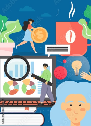 Brand idea vector poster banner template. Brand positioning, creative thinking, idea generation concept with characters, laptop, lightbulb. Flat style design illustration.