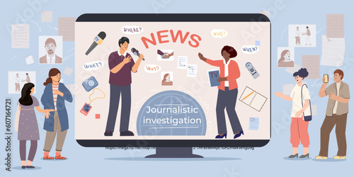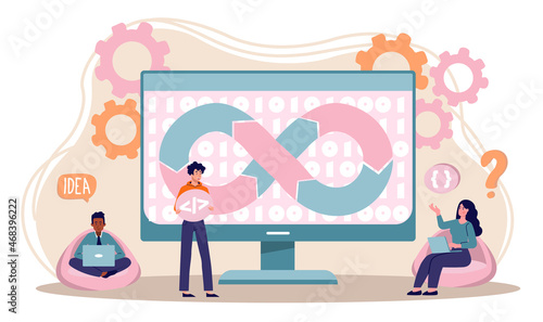 Vector illustration of big laptop with handshake on screen and tiny people characters signing contract. Business agreement, successful partnership, making a deal concept for web banner, website page.