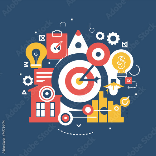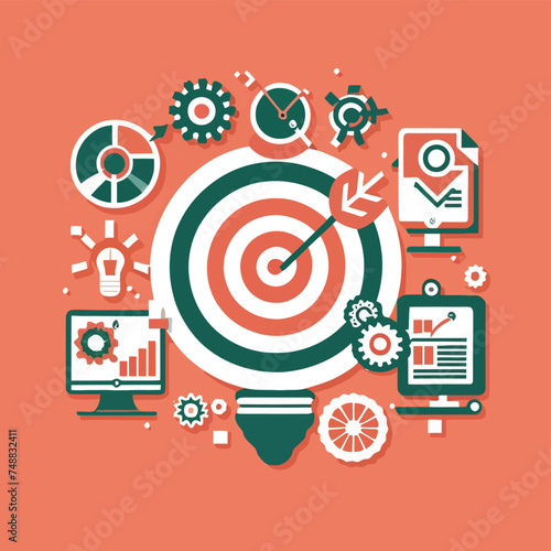 Business analyst vector flat illustration. Laptop, megaphone, target, eye, mobile, magnifier, bar graph and hand with money. Business analysis, audit services concepts for web banner, website page.