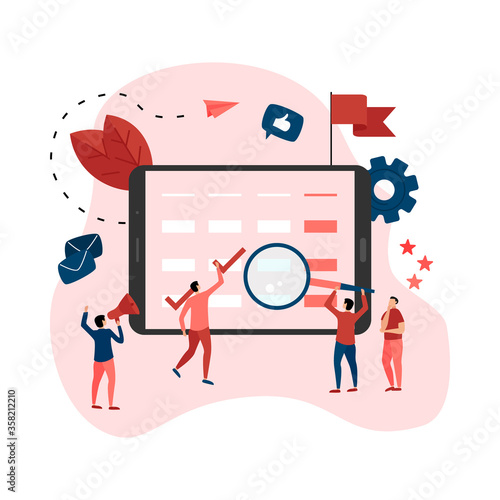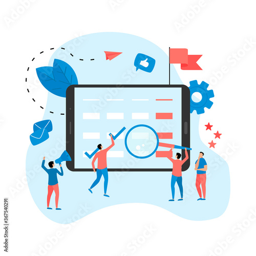 Business people analysts, micro characters interacting with charts on huge tablet screen, vector flat style design illustration. Business analytics, seo, data analysis process, analyst service.