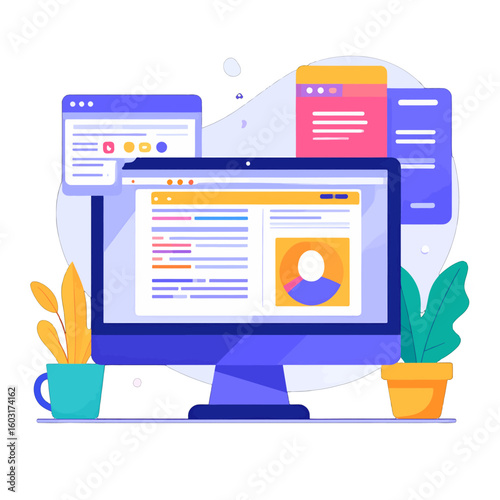 Business and finance concept vector illustration in flat style design. Tablet with financial graphs and charts. Briefcase, calculator, money, paper sheet.