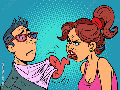 Vector illustration of arm wrestling competition between businessman and businesswoman, speech bubble. Business rivalry concept element in retro pop art comic style.