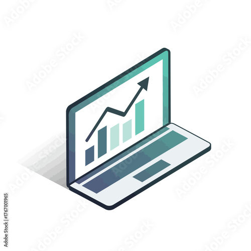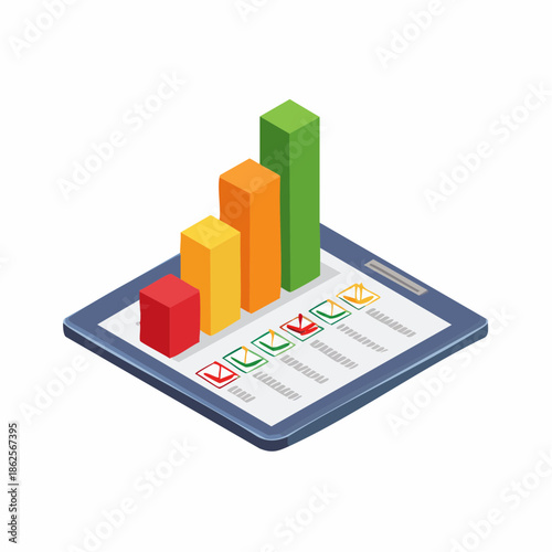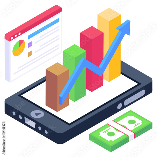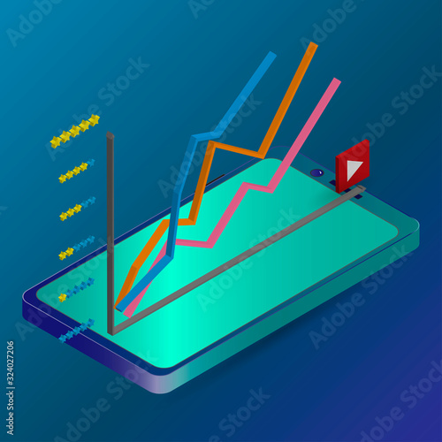 Business data graph chart on vector mobile screen. Finance or market analysis diagram on smartphone. Application for research and statistics collection. Isometric 3d phone isolated on white background