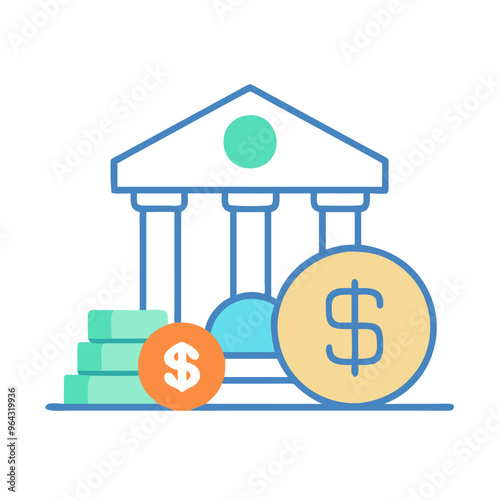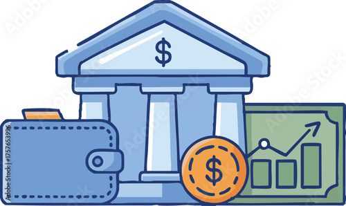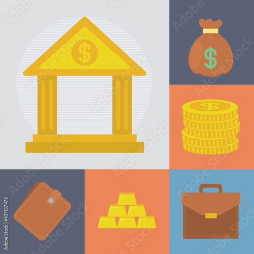 Business icon. Vector 3d bag, briefcase, money wallet and bank building isolated illustration. Financial portfolio suitcase, dollar investment or credit symbol. Banking institution services concept