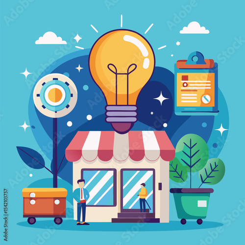 Vector illustration of big light bulb and office people discussing, proposing new business ideas. Innovation, creating new ideas, brainstorming concepts for web banner, website page etc.
