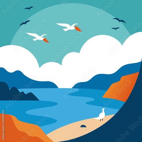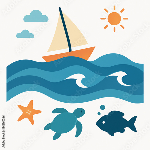 Business leader concept vector poster in paper art origami style. Businessman looking through telescope standing in boat on the top of ocean wave. Business leadership concept.