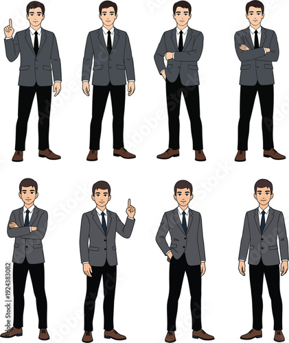 Collection of seven man silhouettes, dressed in business style. Formal suit, tie, different poses. Flat style vector image.