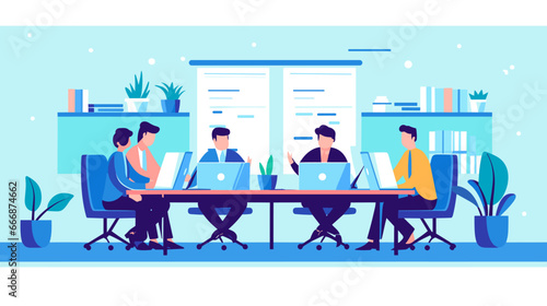 Business meeting concept vector illustration. Businessman makes presentation of new business strategy. Agile team work in office with analytics data board.