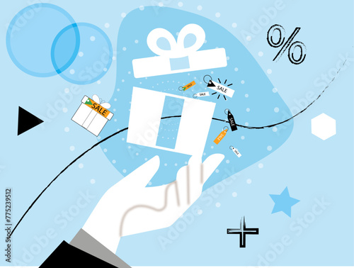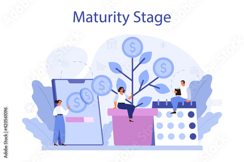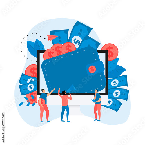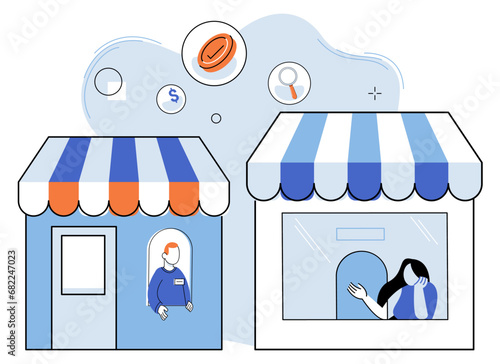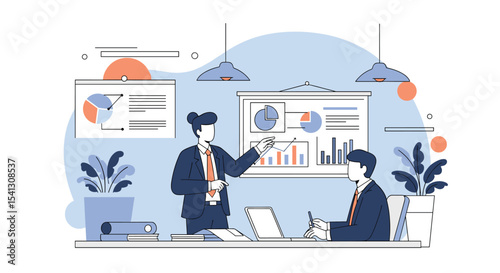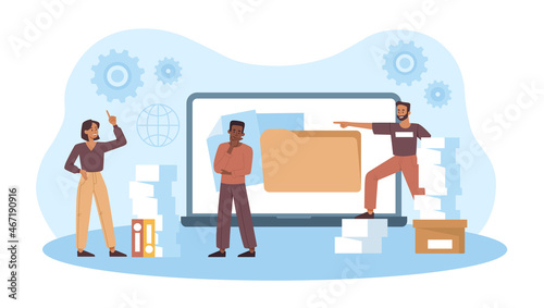 Vector illustration of office people woman working on laptop while sitting on big computer and man looking through binoculars while standing on bar graph. Business metaphorical concept for web banner.