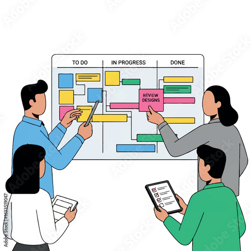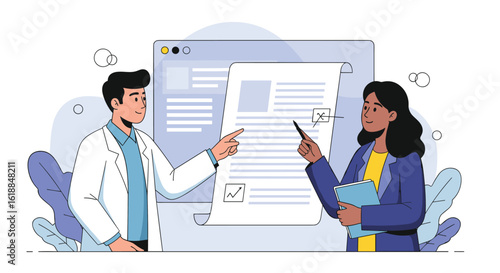 Business people, clipboard with checklist, clock. Woman checking to do list, man showing ok hand sign, flat vector illustration. Task management, planning, time management.