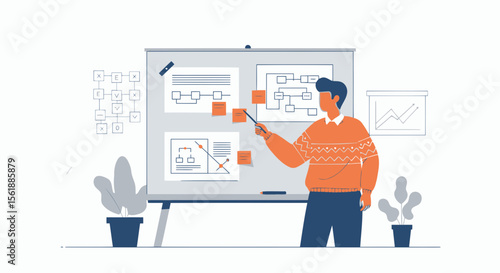 Vector illustration of happy man holding cup of tea in one hand and folders with papers in the other. Business people flat style design element, icon isolated on white background.