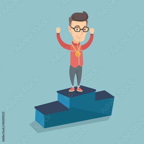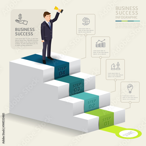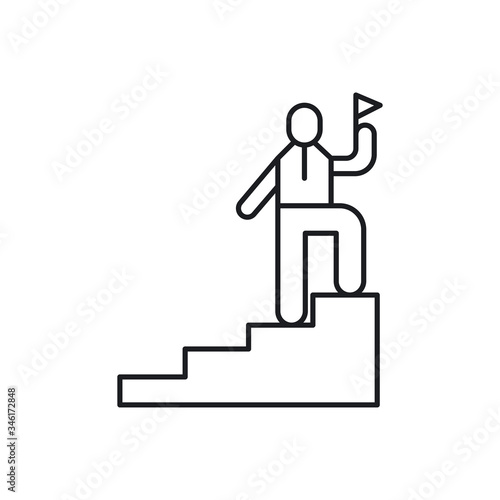 Vector illustration of happy businessman going upstairs with hand raised. Business people flat style design element, icon isolated on white background.