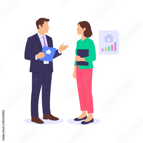 Vector illustration of businesswoman giving briefcase full of paper money to businessman. Business people flat style design elements, icons isolated on white background.