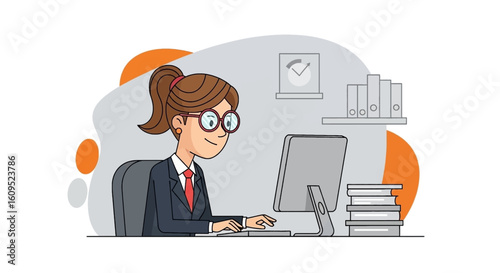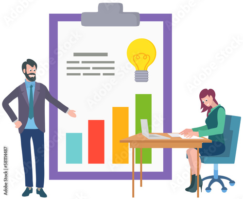 Vector illustration of happy office worker male sitting at office desk and using laptop. Business people flat style design element, icon isolated on white background.