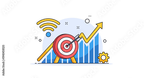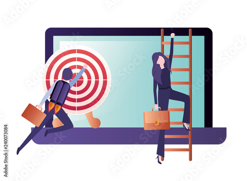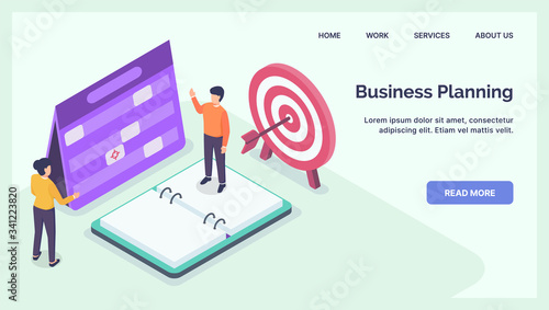 Business people connecting target pieces together, flat vector isometric illustration. Team work, collaboration, partnership.
