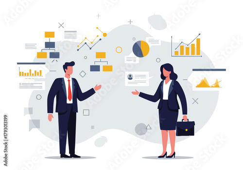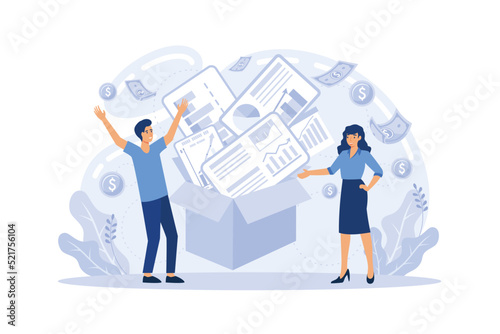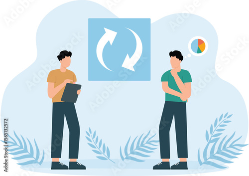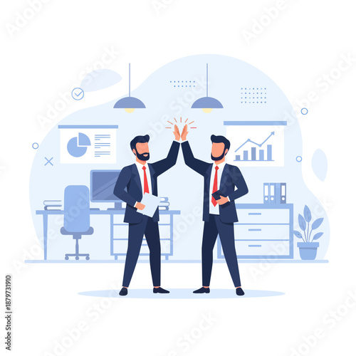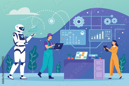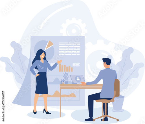 Business people in VR glasses touching virtual reality interface, flat vector illustration. VR education, simulation. Virtual reality technology.