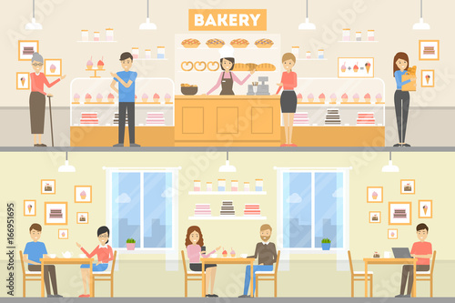 Vector illustration of business people in office, modern workspace and hallway interior with furniture. Flat style design.