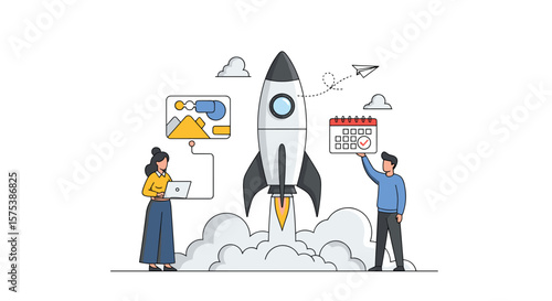 Business people looking at flying rocket, flat vector illustration. Space rocket launch, new business project startup concept.