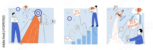 Business people looking at flying rocket, flat vector illustration. Space rocket launch, new business project startup concept.