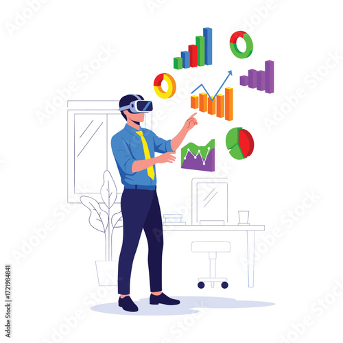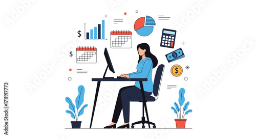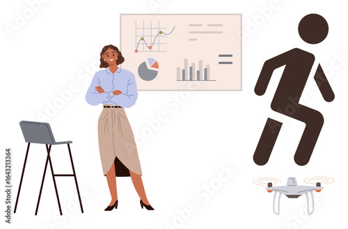Business presentation, vector flat style design illustration. Young woman giving lecture, pointing at graphs on flip chart board. Business workshop, training concept for web banner, website page etc.
