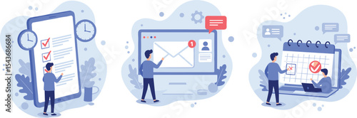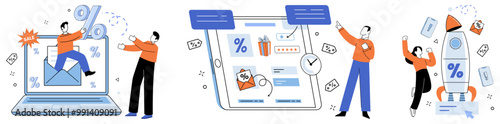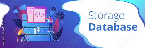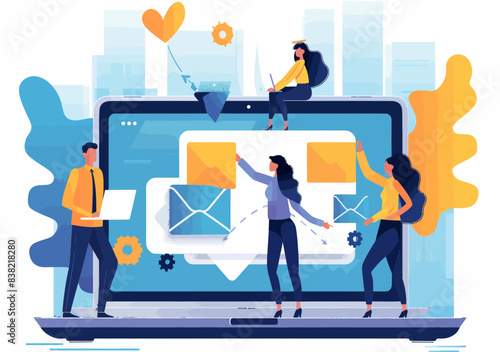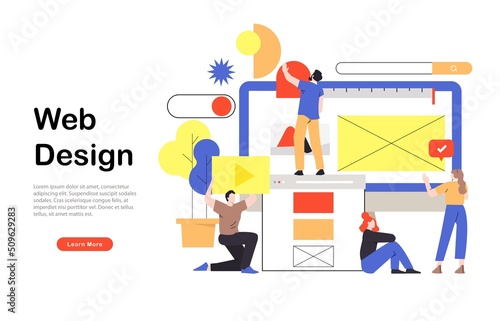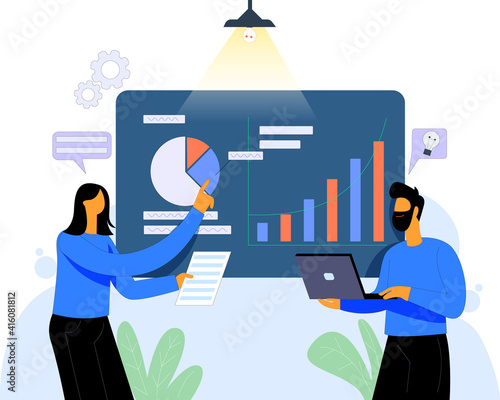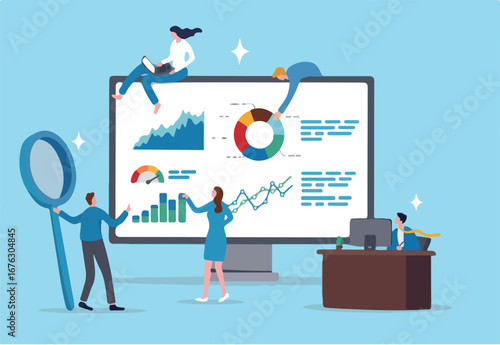 Diamond on huge computer monitor screen and micro male and female characters with wrench, screwdriver, mobile phone, laptop, vector illustration. Business startup concept for web banner, website page.