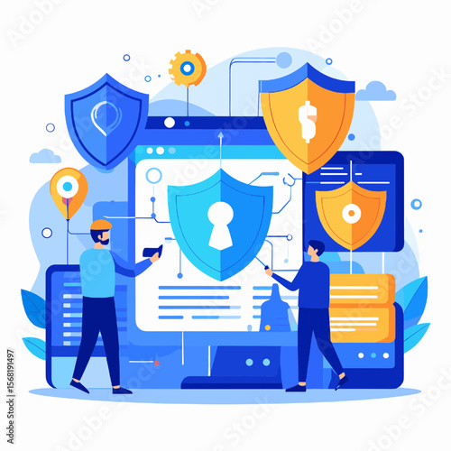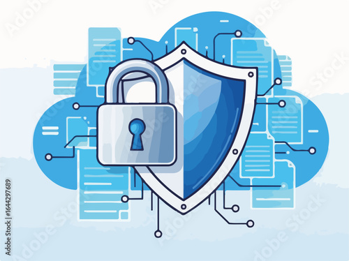 Business protection concept vector illustration. Shield protect data and business from risks. Poster in flat style design.