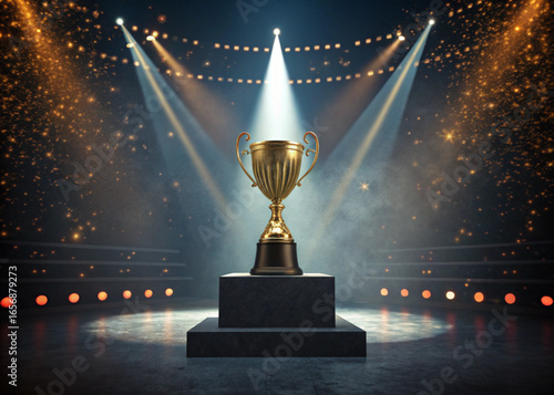 Business or sport competition winner poster web banner template. Vector illustration of white round podium with trophy award cup illuminated by floor spotlights.