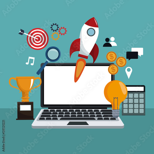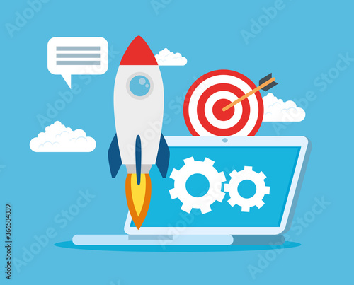 Business startup 3d vector. Online project start and development process. Product innovation, creative idea launch. Rocket ship, target dashboard and computer design illustration