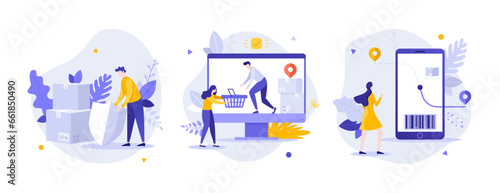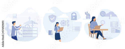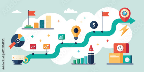 Business strategy set, flat vector isolated illustration. Data analysis, digital marketing, task management, planning, business vision.
