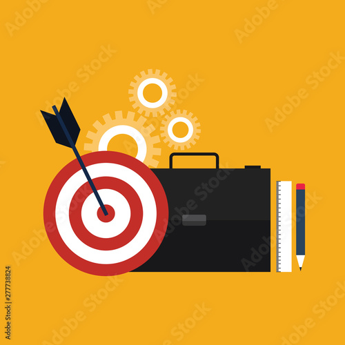 Business strategy vector flat illustration. Tablet with growing graph, target, steering wheel, telescope, human brain, light bulb. Planning, marketing strategy concept for web banner website page etc.