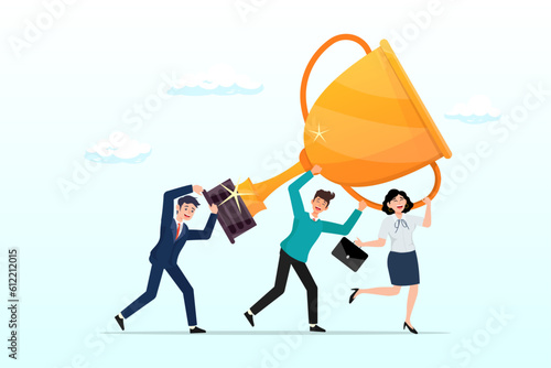Businessman holding award cup in raised hand, vector flat illustration isolated on white background. Business success concept for web banner, website page etc.