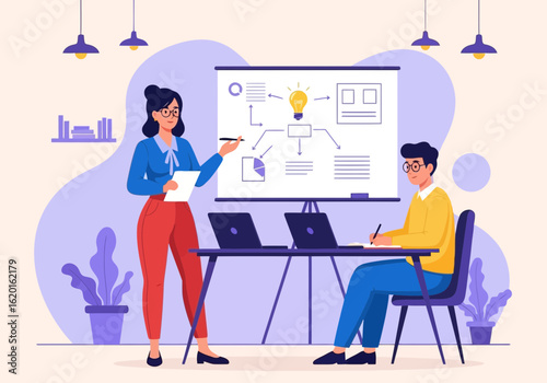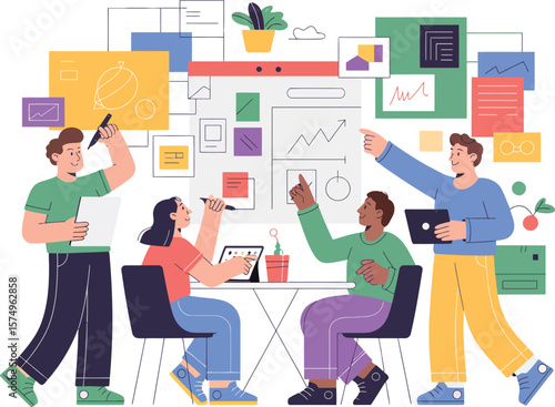 Business team working on city planning project, vector concept illustration. Online business conference, meeting, video conferencing, presentation, team work.