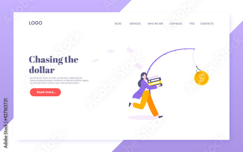 Business team vector website template, web page and landing page design for website and mobile site development. Business people pulling dollar coin on rope.
