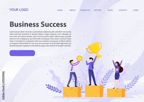 Winner landing page website template. Vector isometric business team and successful winner with cup trophy. Business success concept.