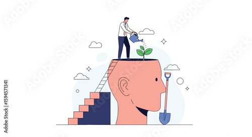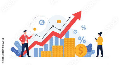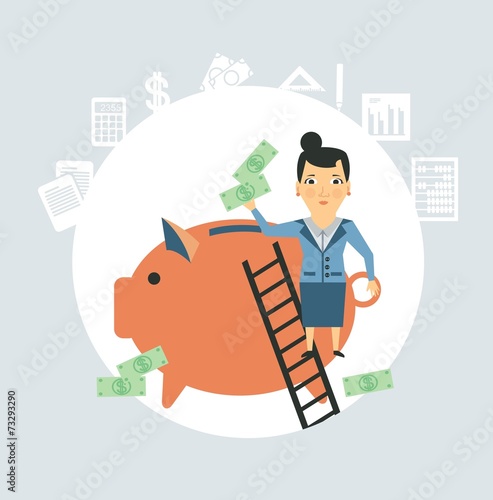 Business woman climbing gold ingot staircase with flag on the top, flat vector illustration. Financial success, investing.