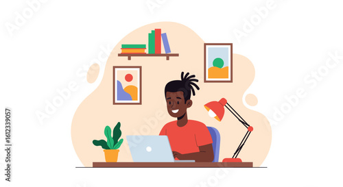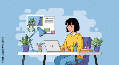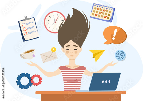 Business woman cooking and working on computer in kitchen, vector flat illustration. Busy multitasking woman holding tablet with charts on screen in one hand, baguette, dough rolling pin in the other.