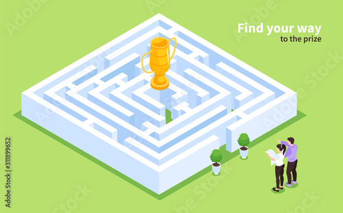 Businessman and hard path to success isometric vector illustration. Office manager standing front of maze thinking strategy trying to choose right way. Goal achievement and labyrinth concept