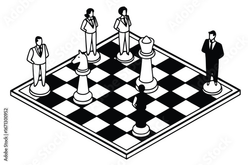 Businessman characters playing chess board game, flat vector isometric illustration. Business competition, strategy concept.