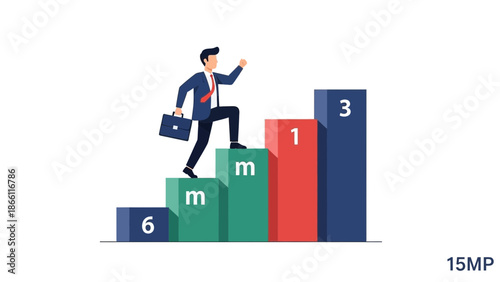 Businessman climbing ladder to success. Goal achievement. Motivation and goal concept to be successful in business and life. Vector illustration in flat design.