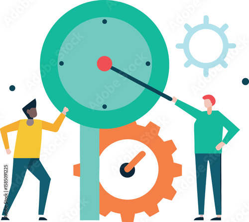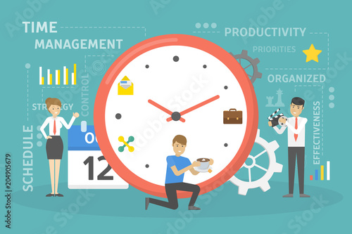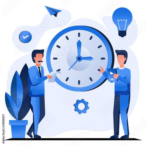 Businessman, employee with laptop standing next to huge clock, flat vector illustration. Online task management, planning schedule, self control.