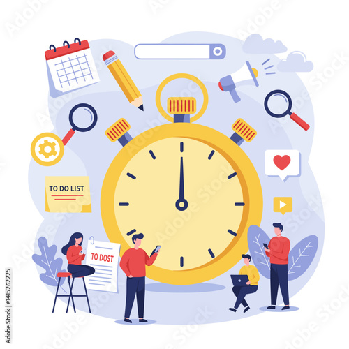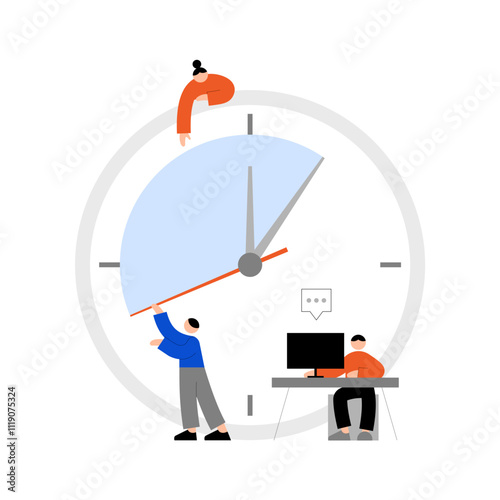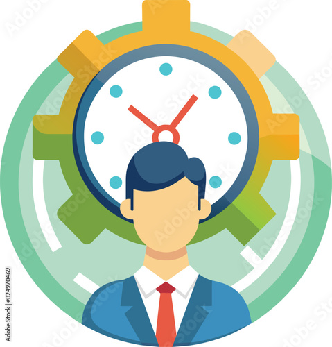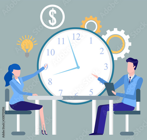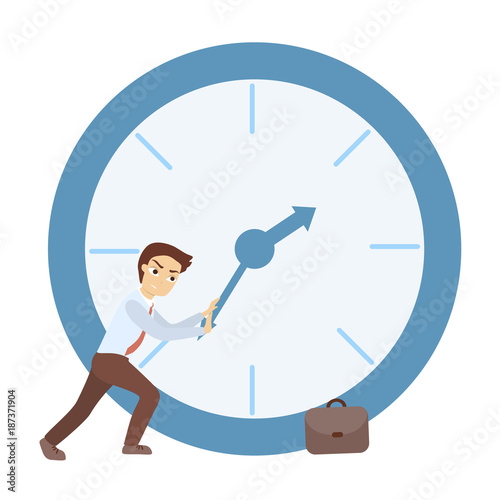 Businessman, employee with laptop standing next to huge clock, flat vector illustration. Online task management, planning schedule, self control.