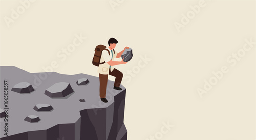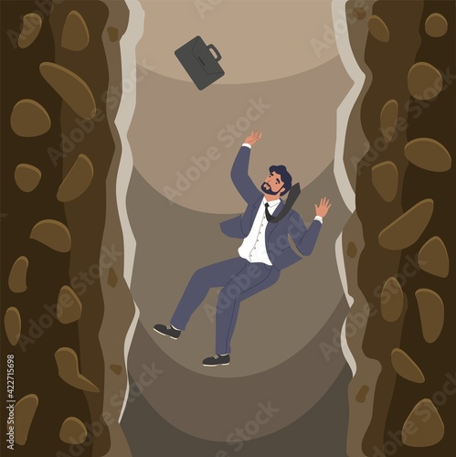 Businessman falling over cliffs into abyss, flat vector illustration. Business failure, bankruptcy, financial problems, career collapse. Business risk.