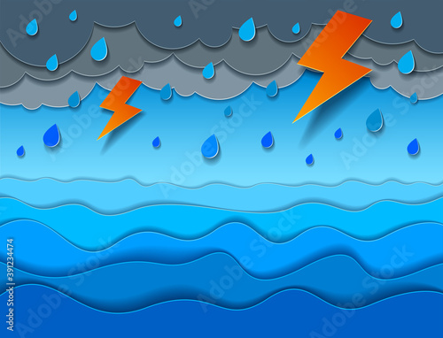 Businessman in boat on the top of ocean wave, vector illustration in paper art style. Business leader looking through telescope. Drowning in water paper boats. Business strategy, vision, success.