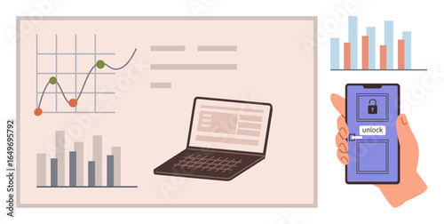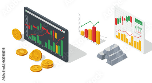 Businessman investing money in stock market, bank deposit, gold ingot from mobile phone, flat vector isometric illustration. Financial investing online service. Mobile investment apps.